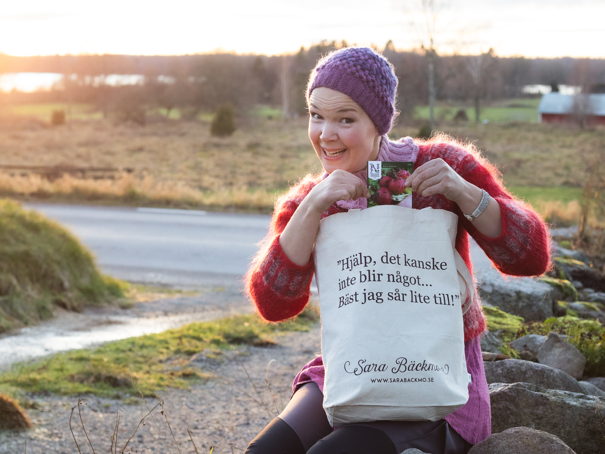 Sara sitter på stenmuren med tygåsen och fröer i handen.