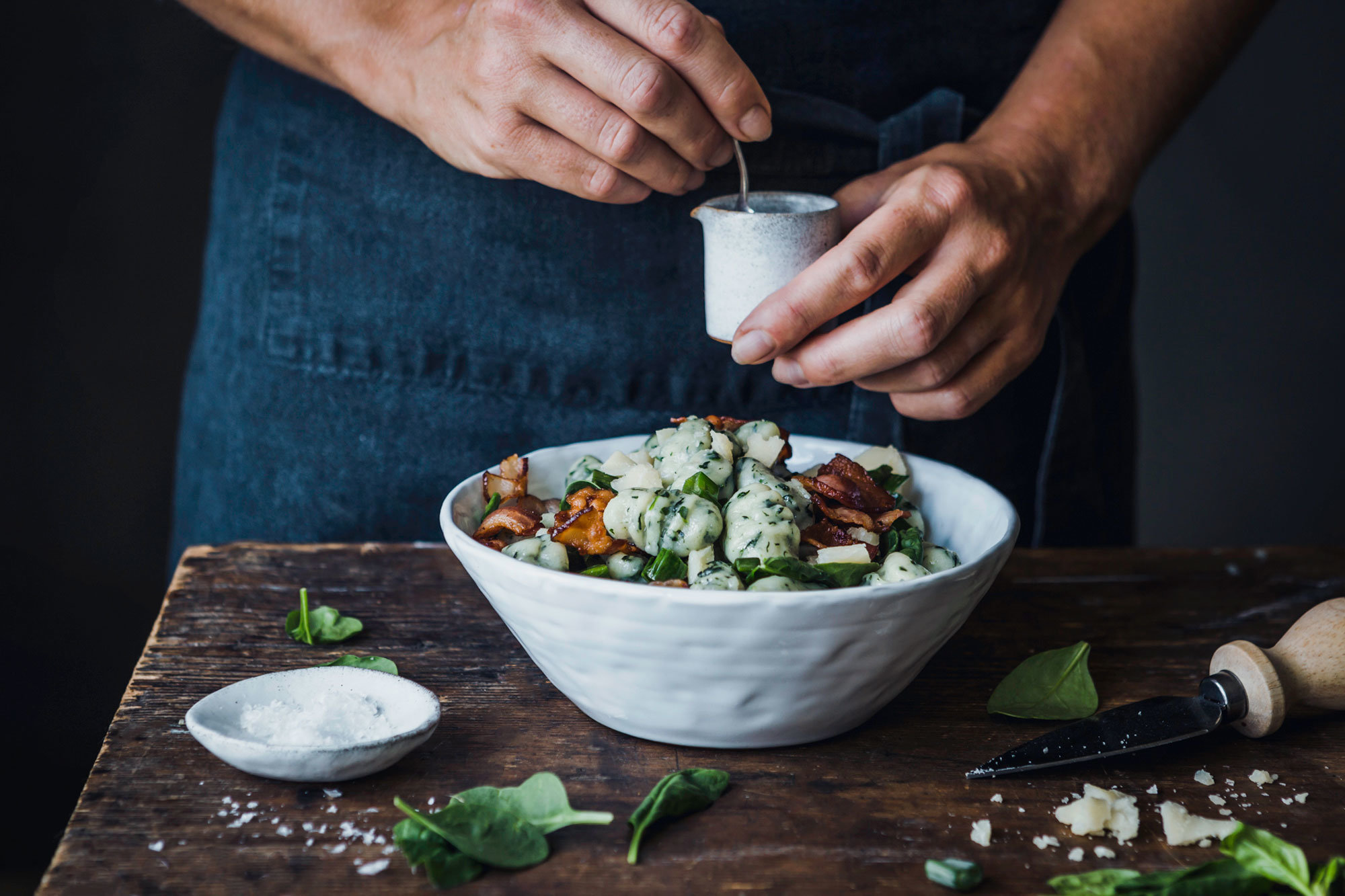 Två händer, ett mörkblått förkläde och ett bord med en tallrik full av gnocchi och grönsaker.