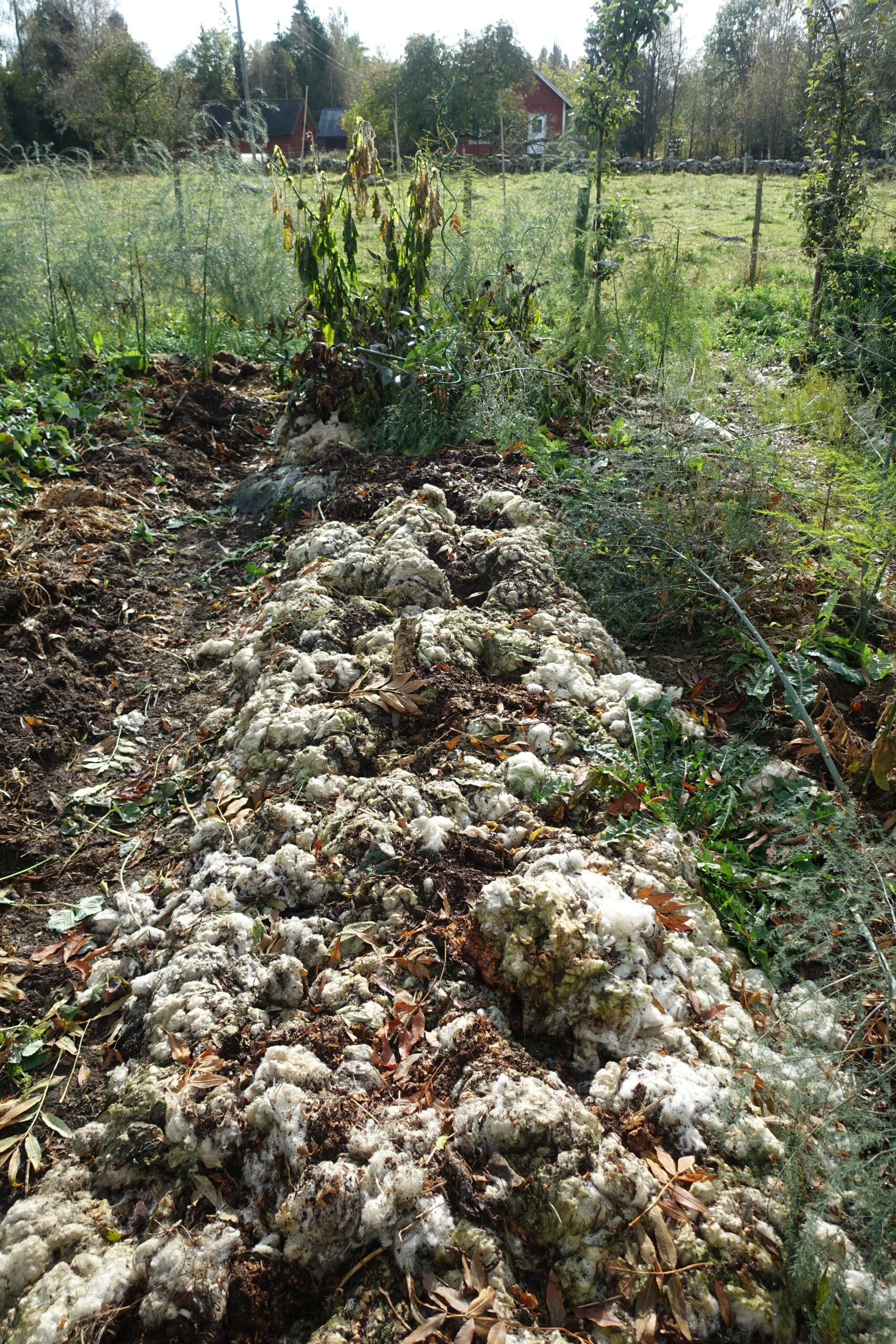 Odlingsbädd täckt med ett tjockt lager av fårull. Så småningom förmultnar ullen och blir till jord.