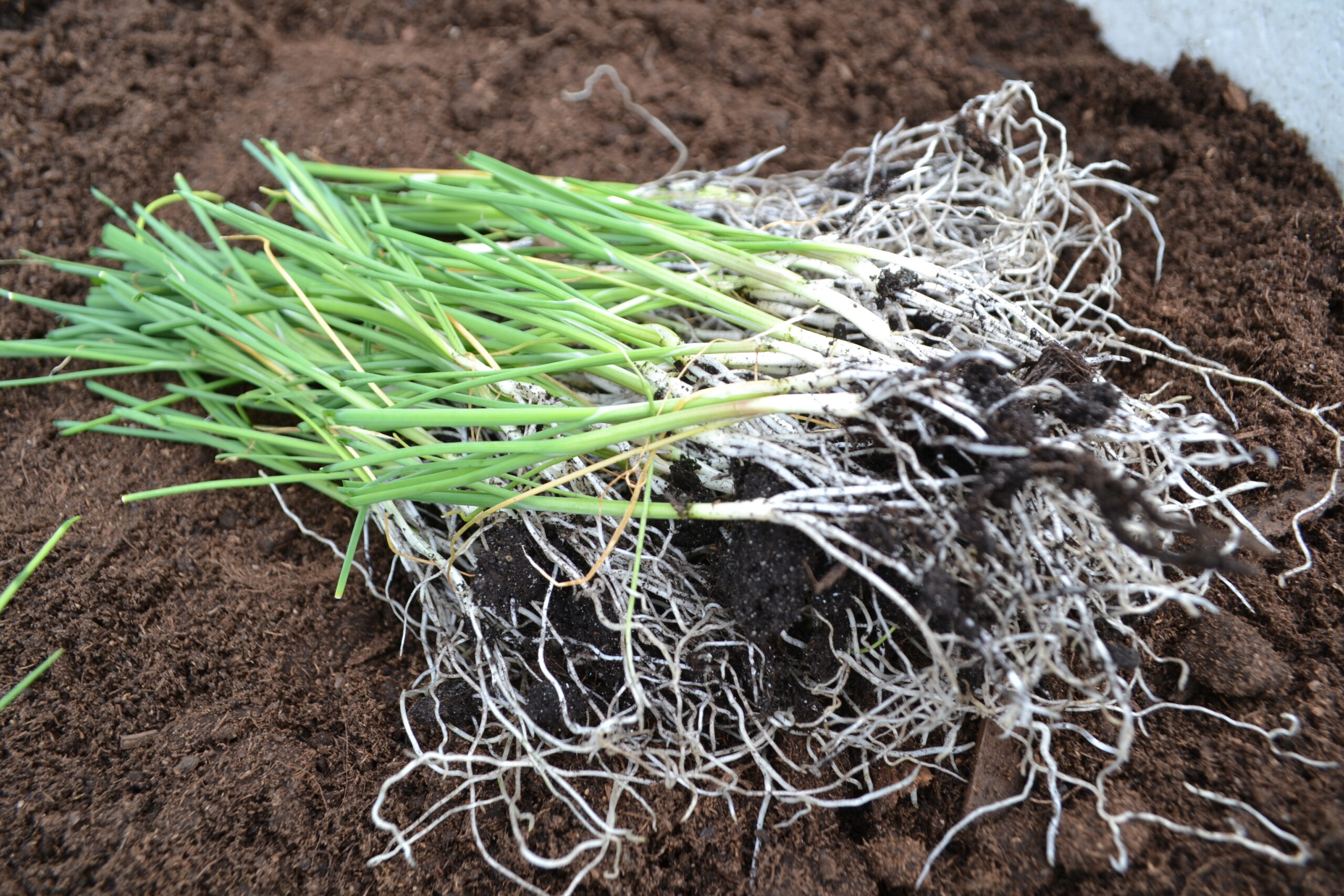 Massor av liten lök med rotsystem.