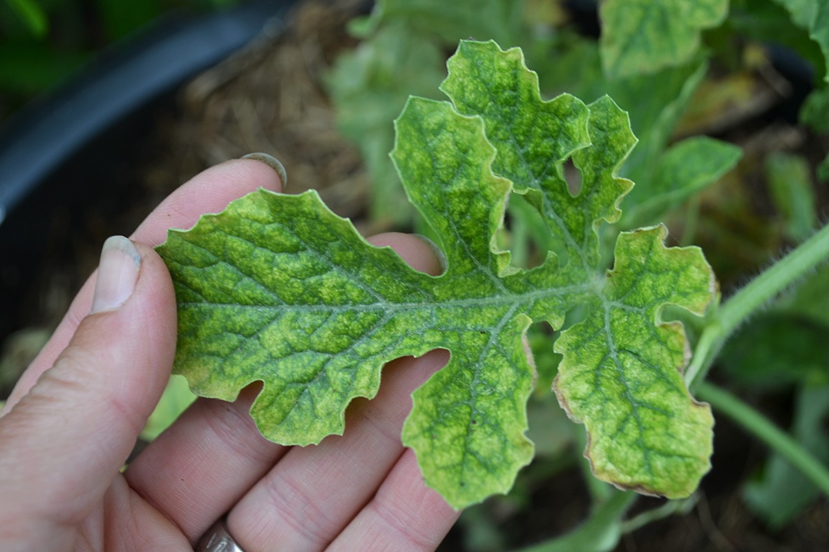Närbild på ett blad från en melonplanta.