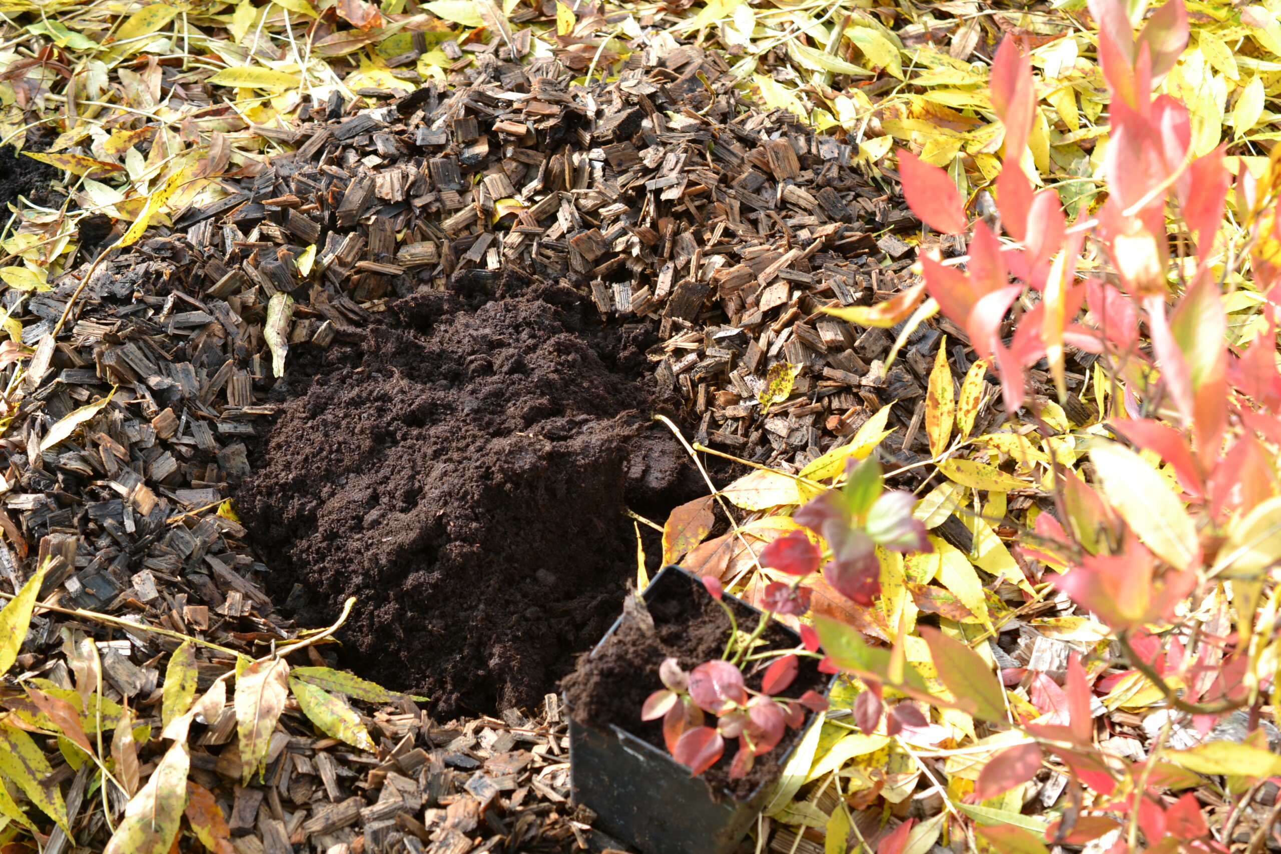 Ett planteringshål med jord och torv, bredvid en blåbärsbuske som ska planteras.