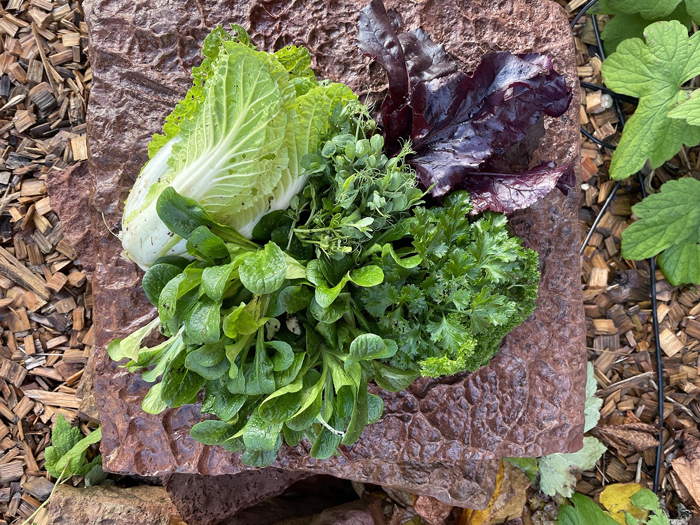 Nyskördade grönsaker på en sten - salladskål, vintersallat, ärtskott, persilja och rödbladig sallat.