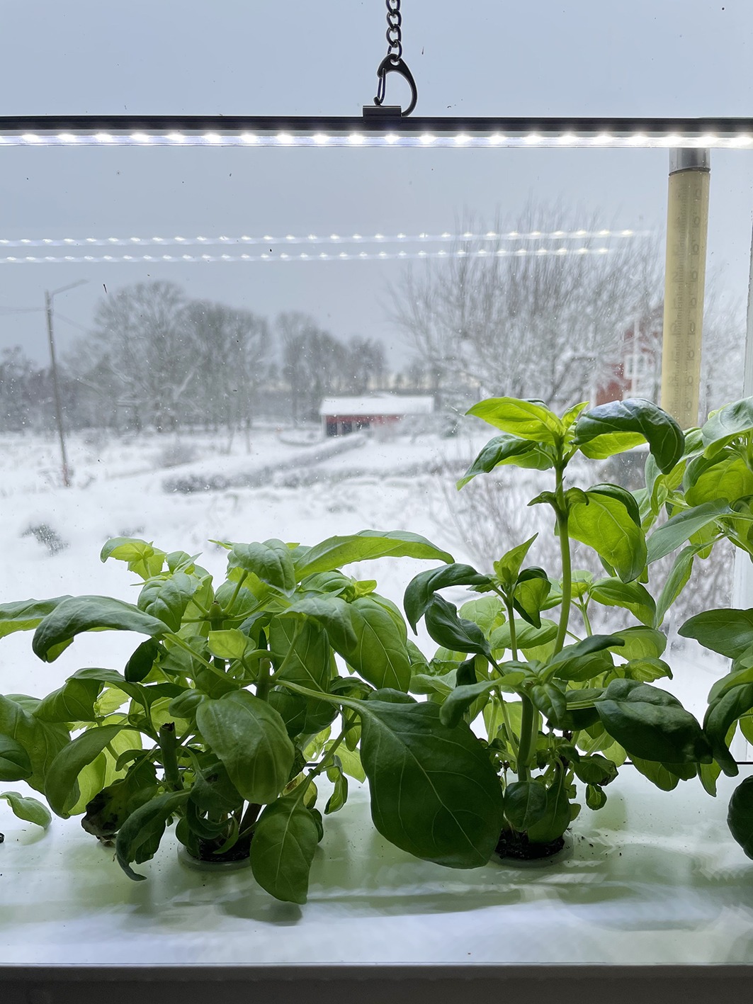 Gröna frodiga basilikaplantor i en hydroponisk odlingslåda under växtbelysning.