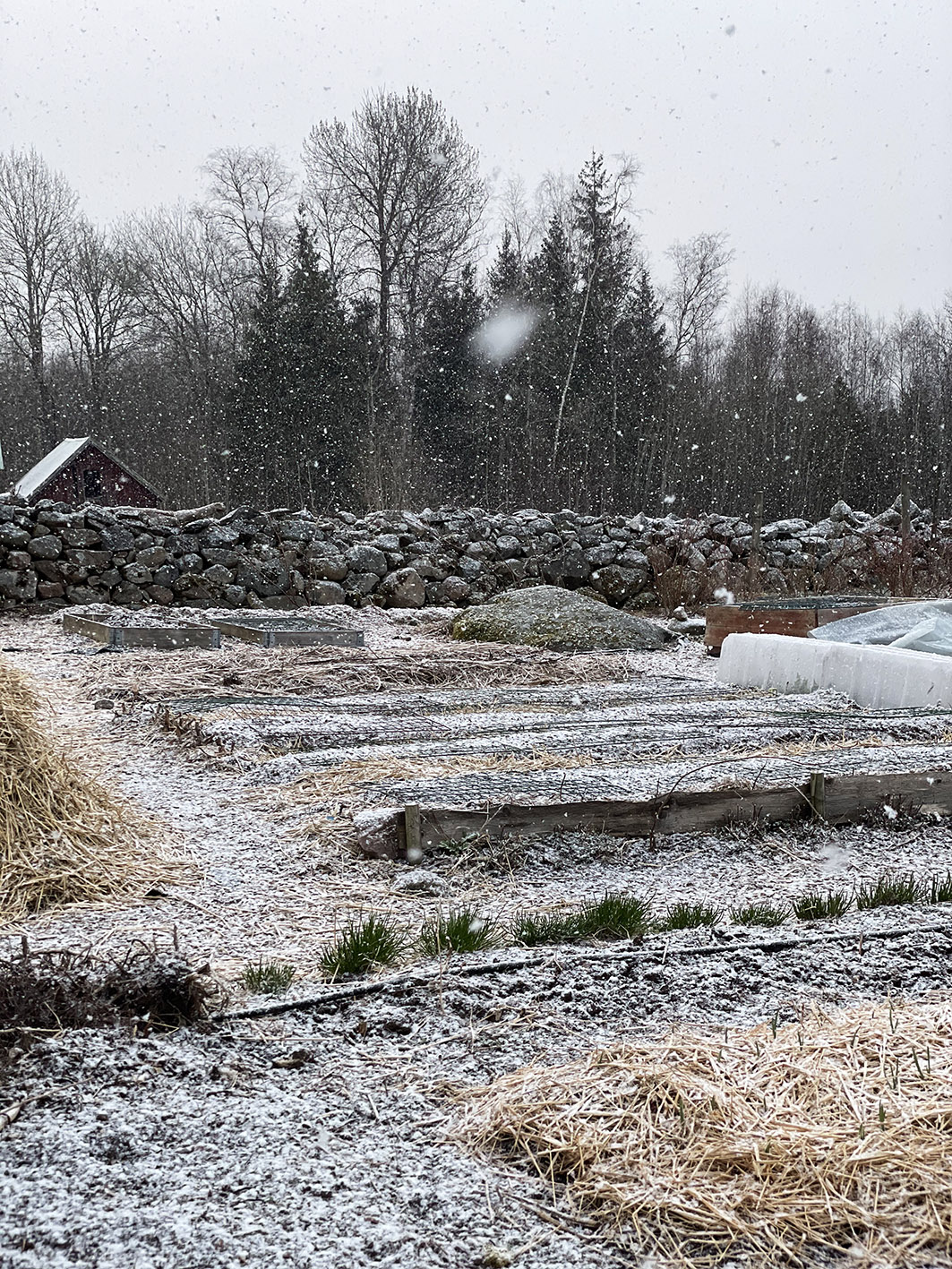 sara bäckmo, sara backmo, skillnadens trädgård, sara's kitchen garden, gräslök, chives, snow, snö