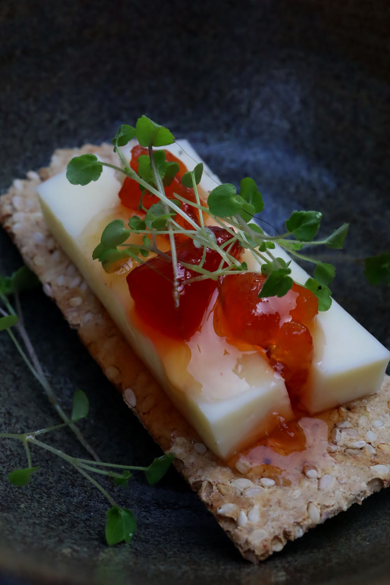 Man behöver inte gå på restaurang för att äta en gott. Knäckebröd med getost, päronmarmelad med rom och aninsisop på toppen.