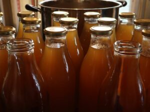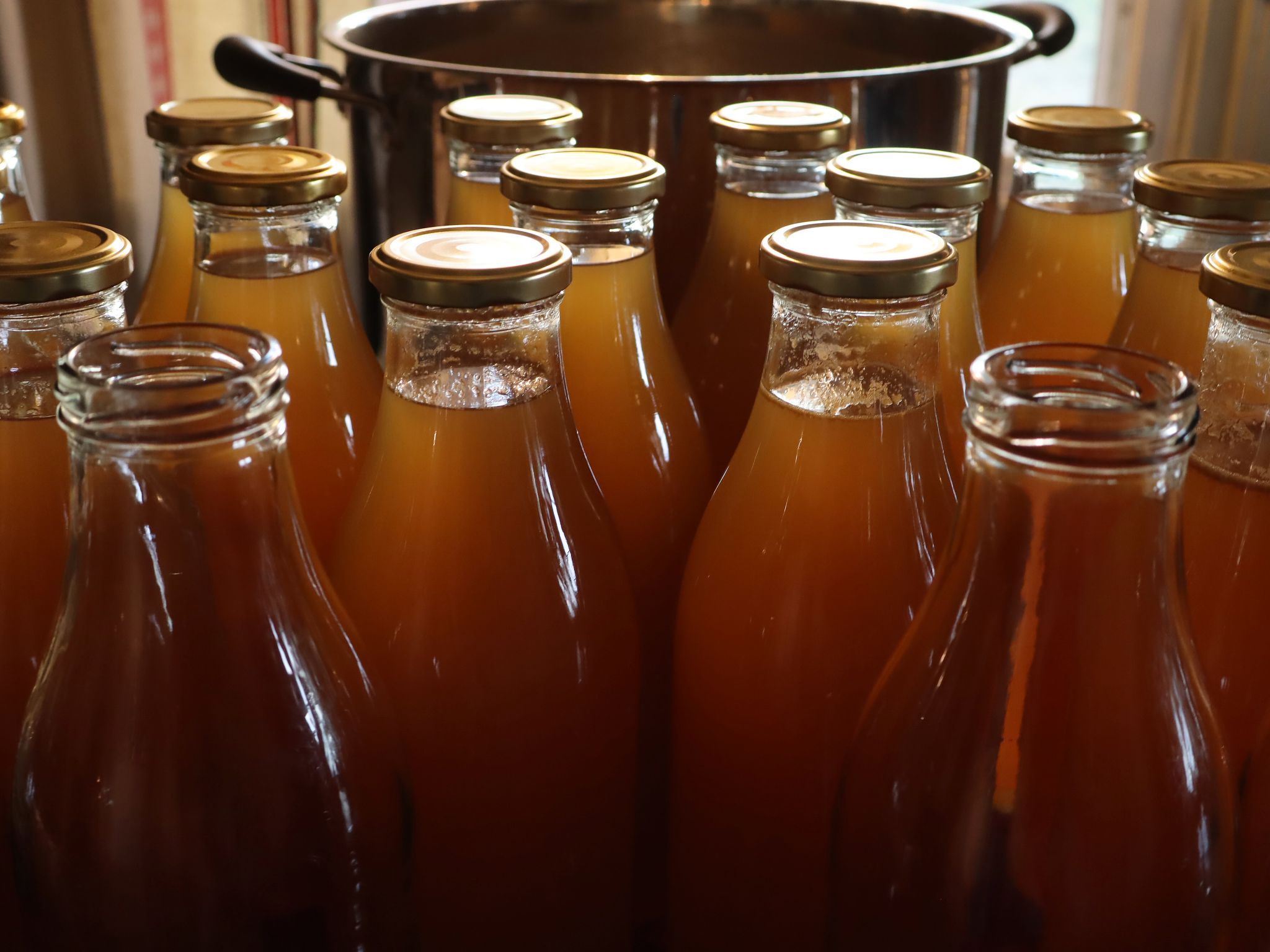 28. September 2025Den färdiga äppelmusten är tappade på enlitersflaskor i glas. De håller i flera år.