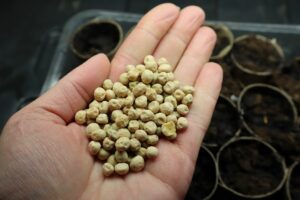Sockerärter sår jag i kluster för att få stadiga plantor som ger mycket på liten yta. Sorten heter 'Norli' och är en låg sockerärt med små tidiga baljor.