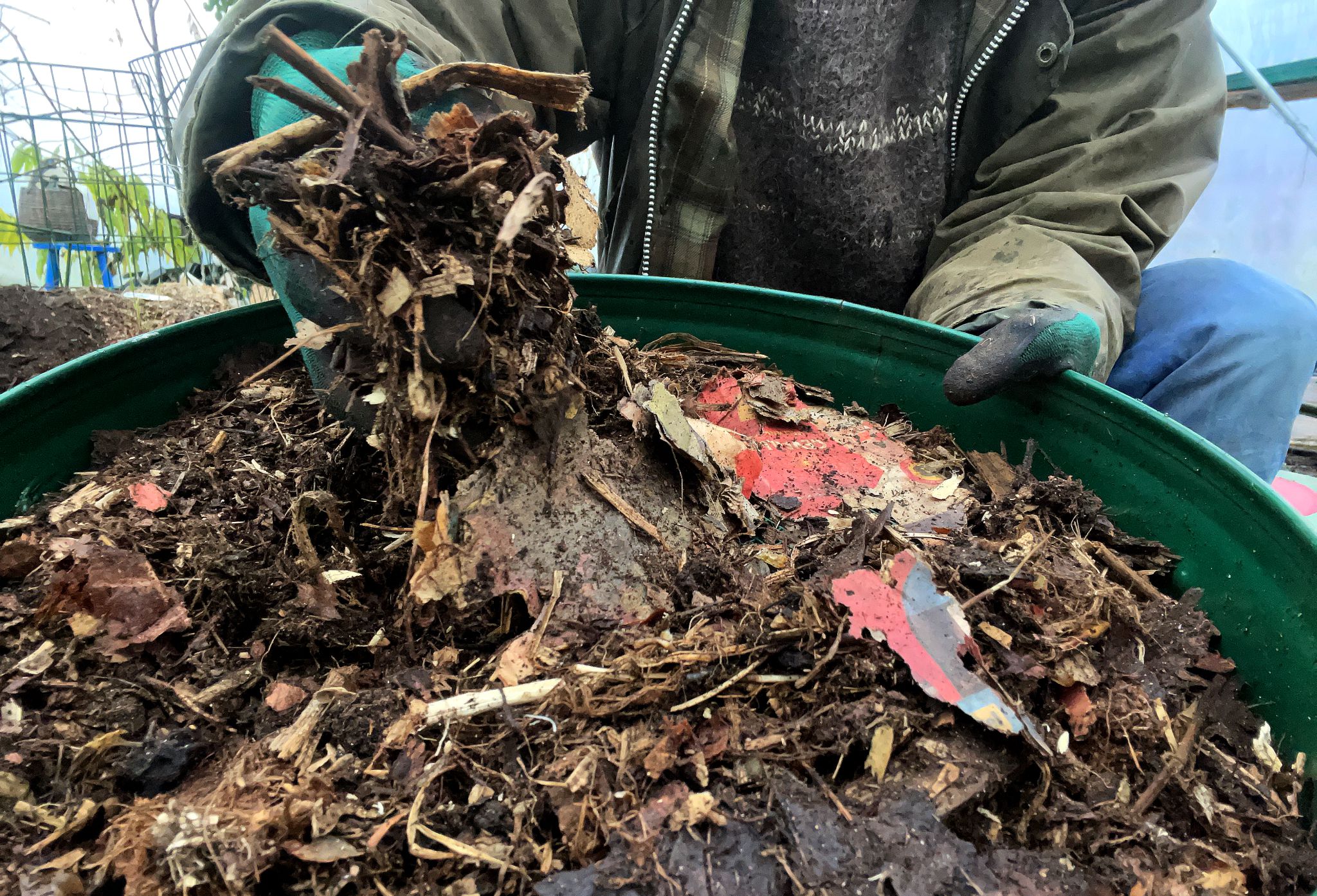 Delarna som blir kvar när jorden sållats bort är ickekomposterat material, som jag lägger i botten på krukor eller i nya komposter.