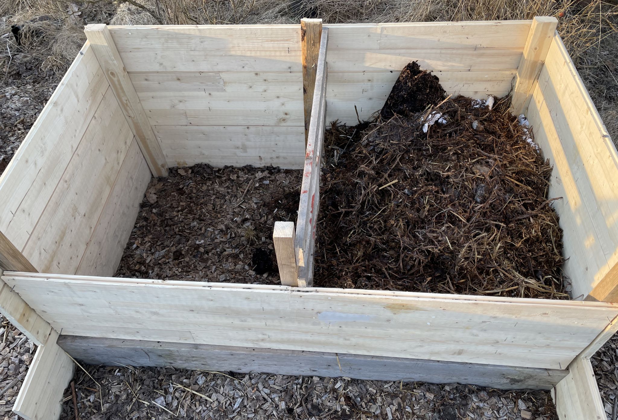 Så här ser komposten ut ovanifrån. Du ser reglar i de fyra hörnen och skivor/brädor som klär in komposten.