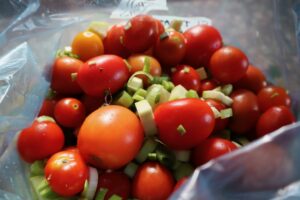 Tomat och andra grönsaker förberedda för frysen inför vinterns matlagning.