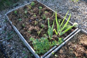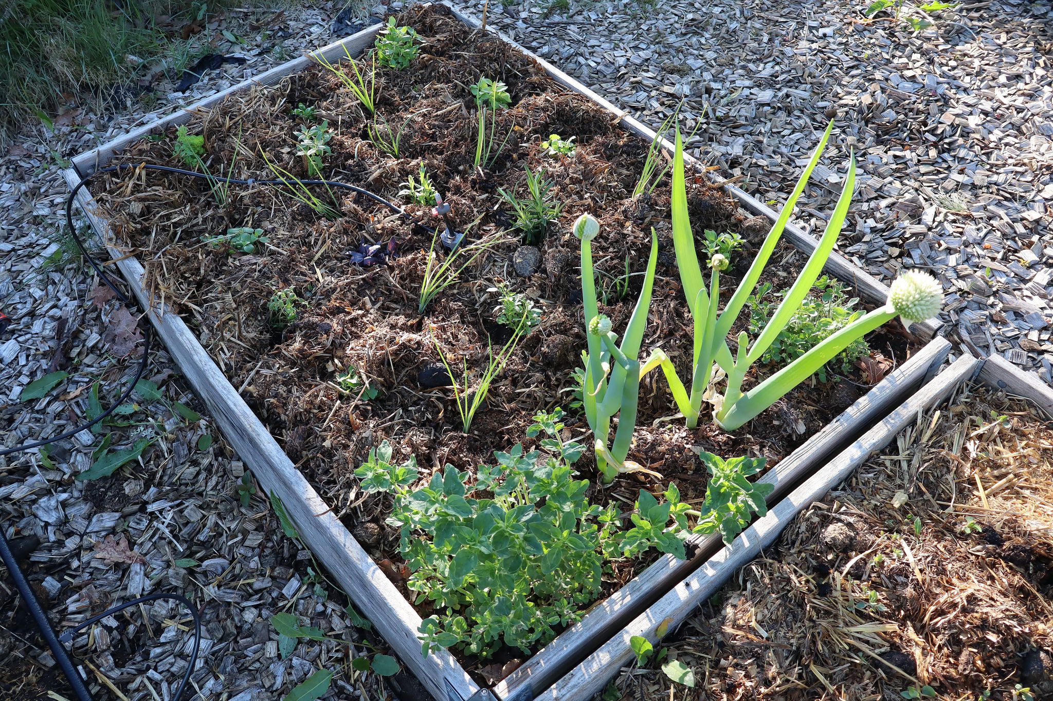 När planteringen är gjord sätter jag dit en sprejknapp från bevattningen, som ser till att pallkragen vattnas en gång om dagen via mitt bevattningssystem.