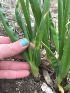 Det är de små pigga skotten av lök som jag använder i matlagningen. Varje planta består av många lökar och de flesta av dem kan utan problem skäras bort utan att löken tar skada. Lämna dock ett gäng som löken kan föröka sig genom.