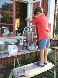 Kort medhjälpare behöver stå på en pall för att dra åt pressen. Jag har en ganska liten press, men den är effektiv att jobba med. Om man är två som jobbar går det att musta många liter på kort tid.
