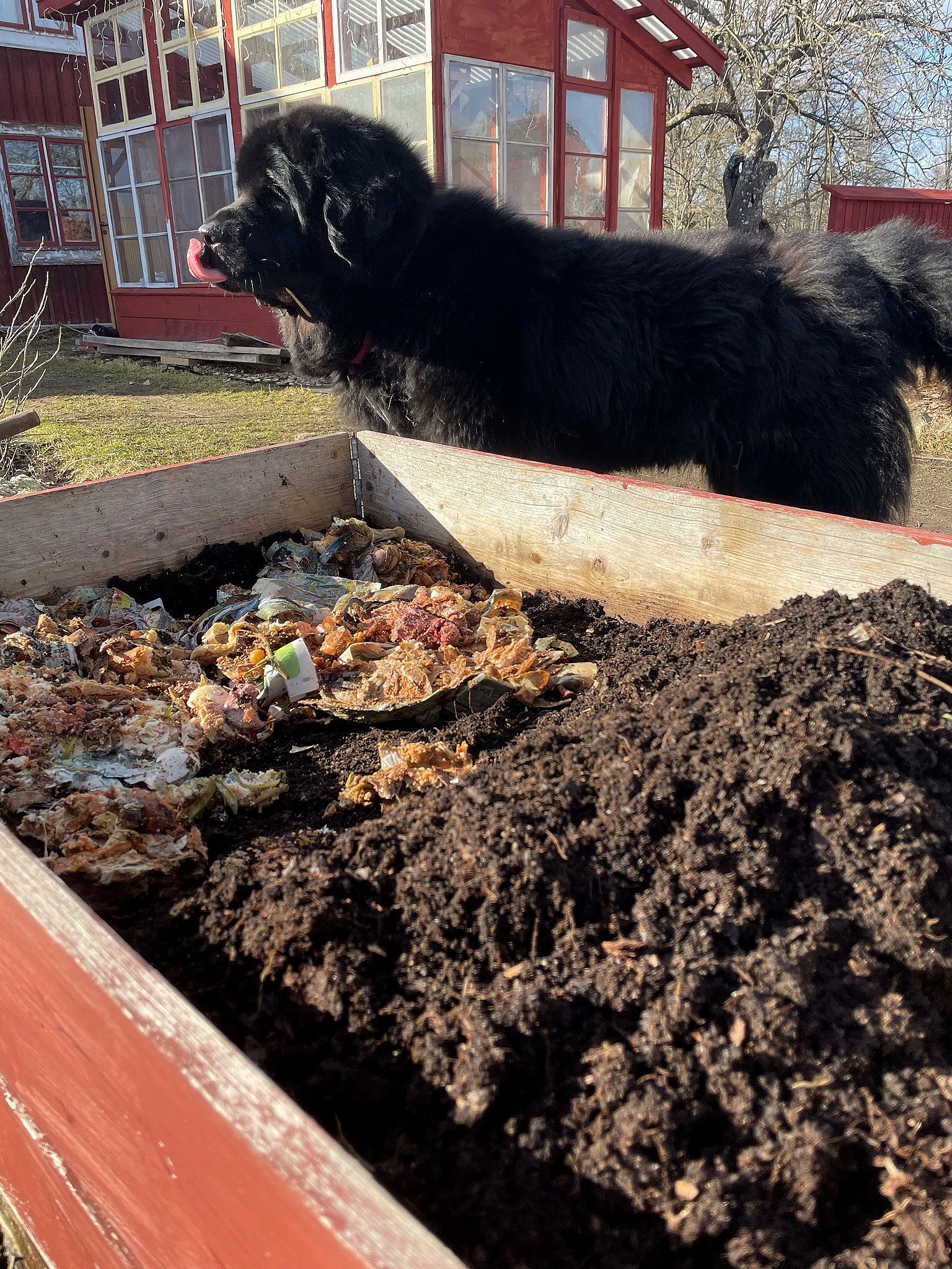 Här har jag fyllt på med en hink bokashi-kompost. Mums tycker vår hund Kuling. Aja baja, säger jag! Hundar som äter bokashi luktar absolut vidrigt!