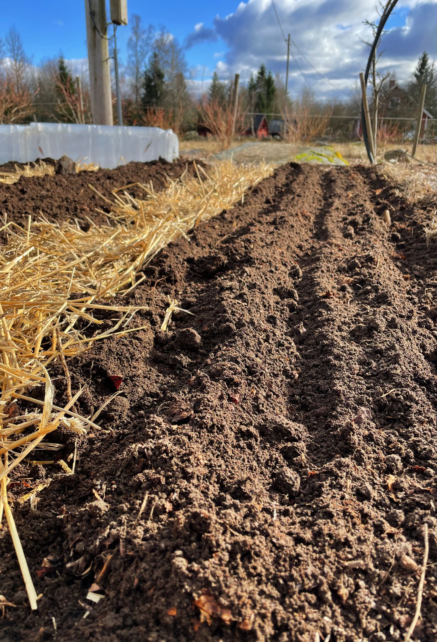 Närbild på odlingsbädd med tre fåror uppdragna.