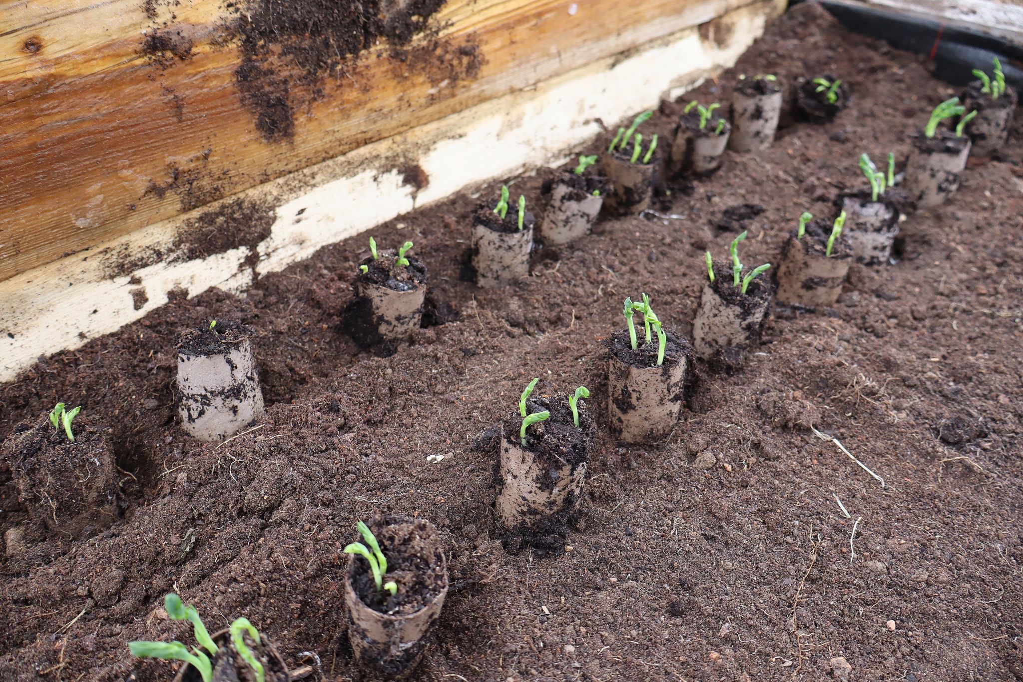 19. February 2024Alla pluggar med sockerärter får plats i två rader, där jag sedan ska sätta ris emellan som ärterna kan klänga på.