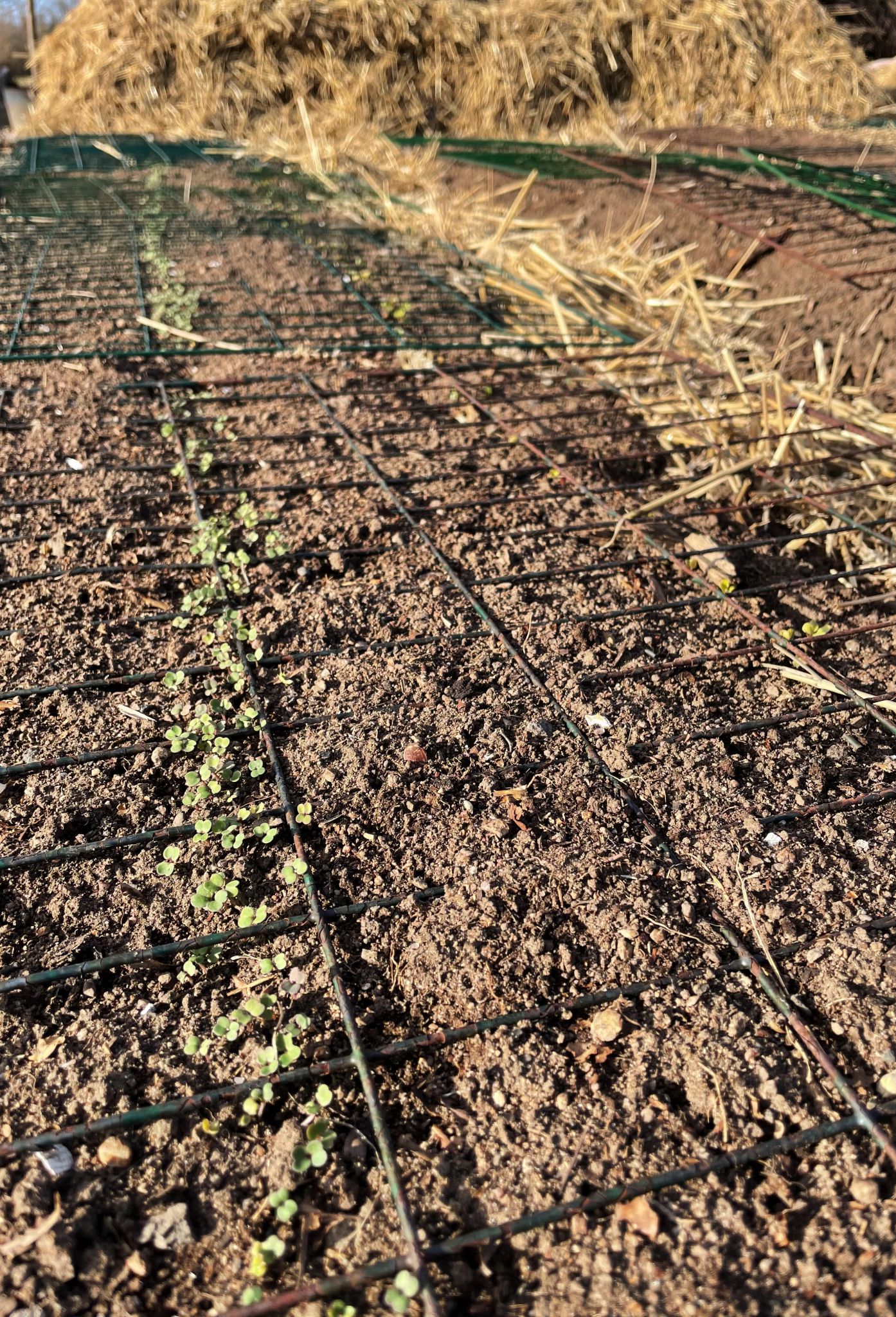 Titta! En tidig vårsådd av rucola gror på friland. Jag lägger kompostgaller på så att inte katterna ska krafsa sönder sådden.