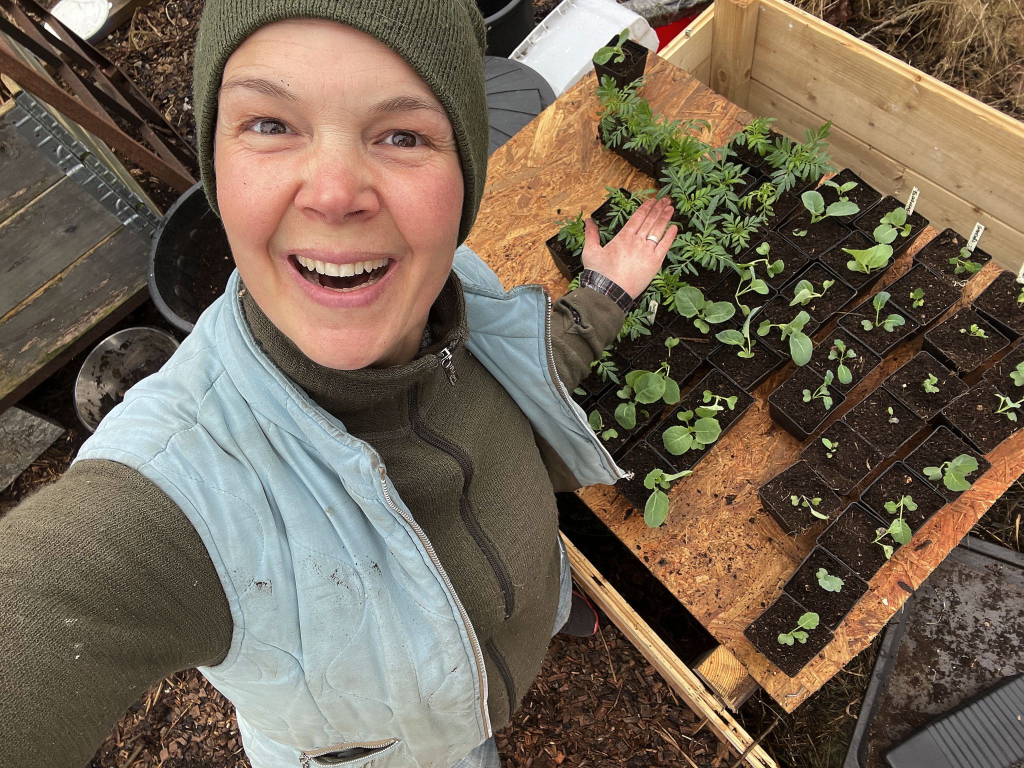 Glada tider när försådda plantor skolas om till egna krukor - ett nytt steg i deras resa ut mot köksträdgården.