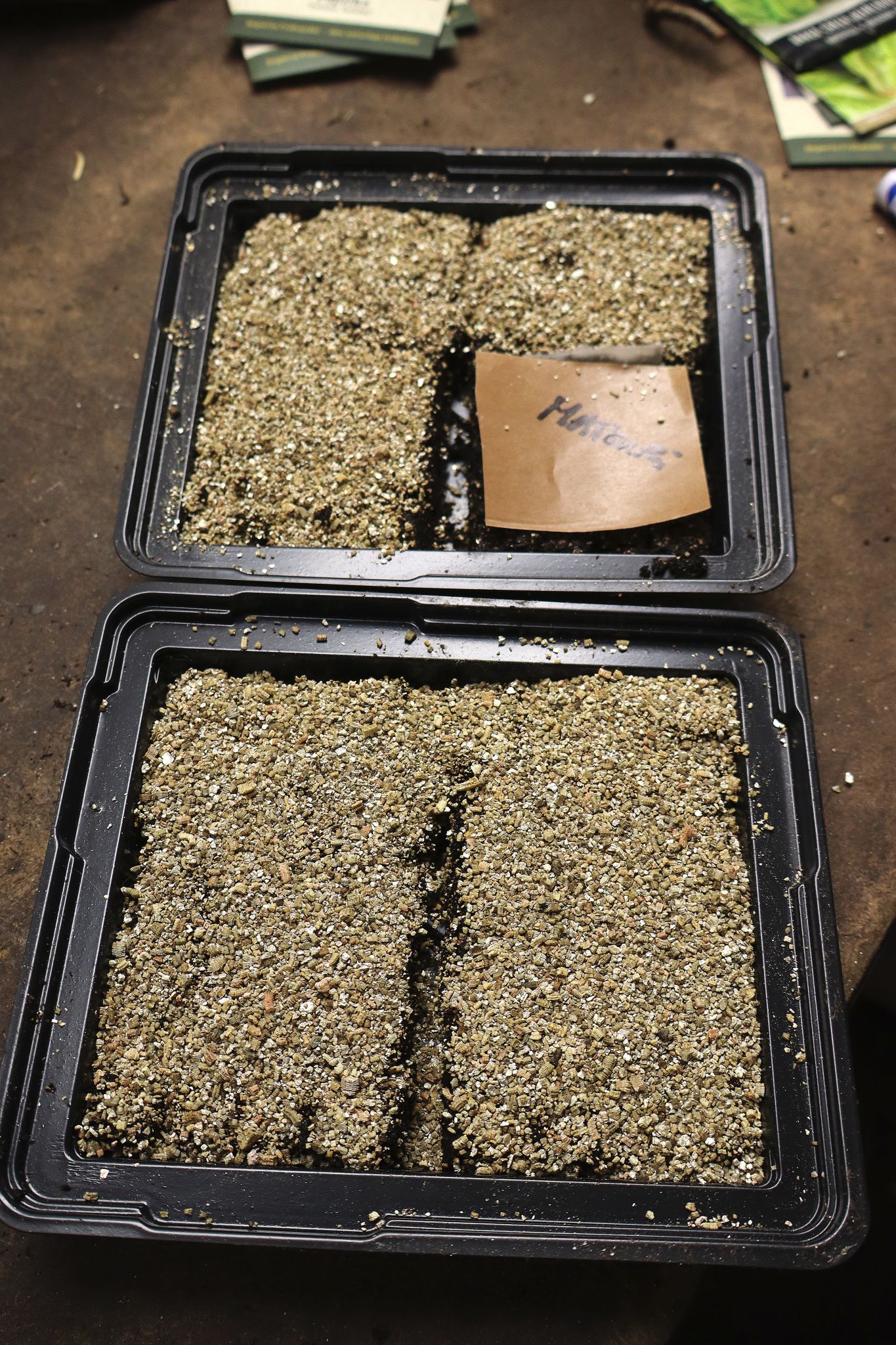 Så här ser min sådd ut när den är klar. Jag har lämnat några block tomma och ska så de sista fröerna hemma. Sådden ställs på badrumsgolvet och täcks där av ett plastlock eller en tunn genomskinlig plast.