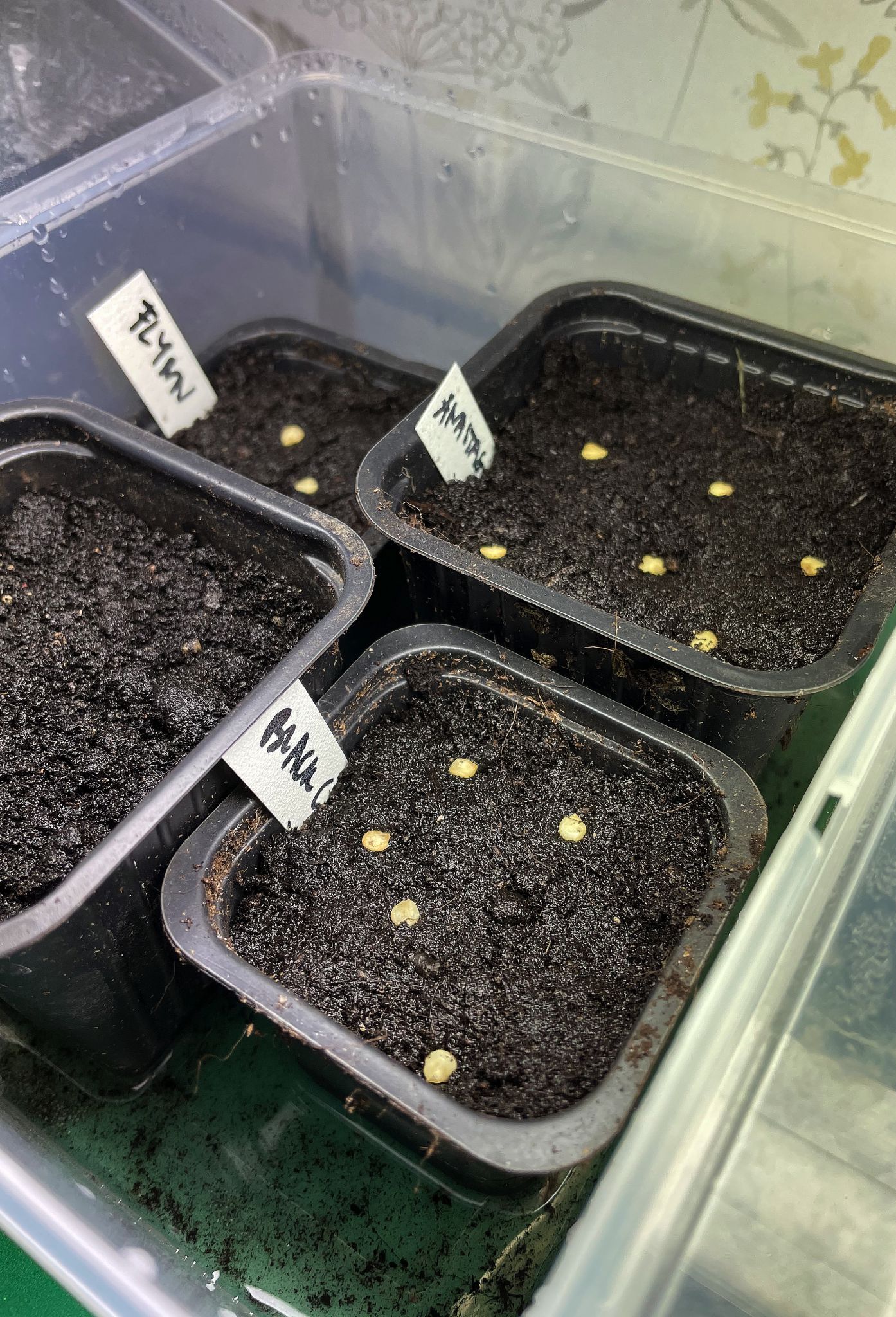 Här har jag sått paprika och trädgårdsnejlikor. Paprika gillar att ha det varmt under tiden de gror. Jag sår dem också utan att täcka fröerna med jord, då gror de så himla fint. I varm jord och med växtbelysning över utvecklar fröerna en liten 'svans' på bara några dagar.