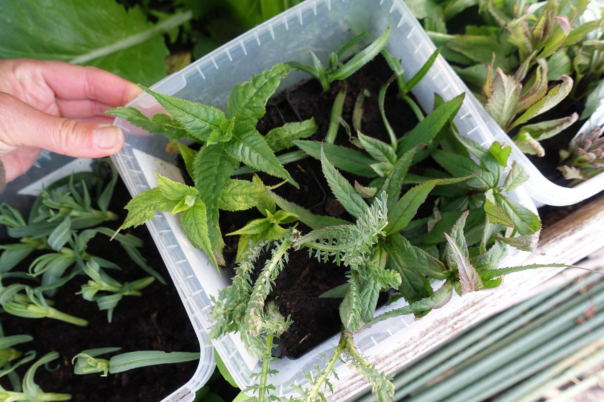Fyra krukor i en godislåda med bottenskyla vatten - så fixar jag sticklingar av perenner.