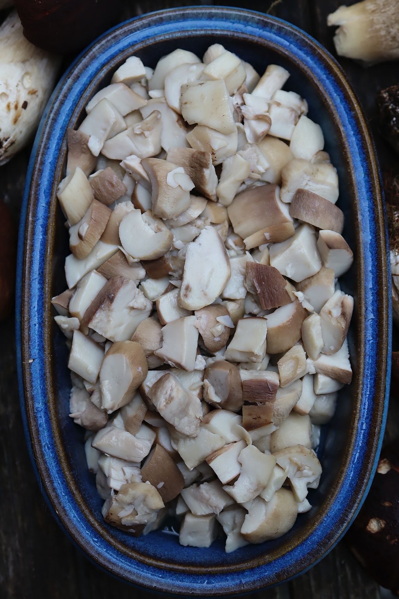 Innan svampen körs i matberedare förvälls den, det ger bäst resultat.