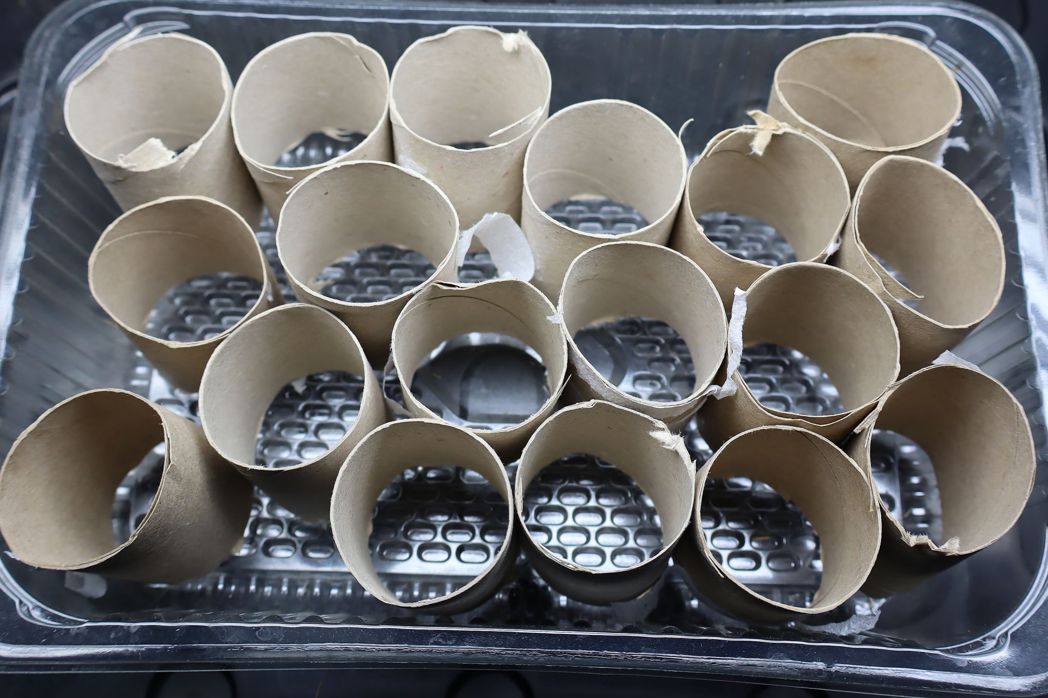 19. February 2024Grunden till min sådd av sockerärter; ett gammalt tråg för köttfärs och ituklippta toalettpappersrullar.
