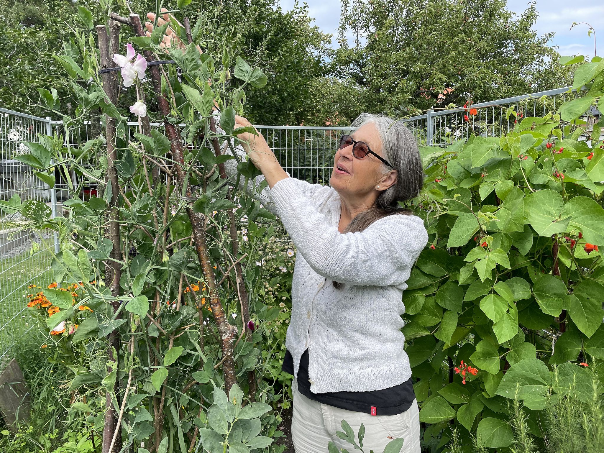 08. August 2021Min mamma Ulla Herlitz på Styrsö, fotograferad i sin hundgårds-trädgård som skyddar mot rådjur. Luktärtstornet har äntligen fått vara ifred!