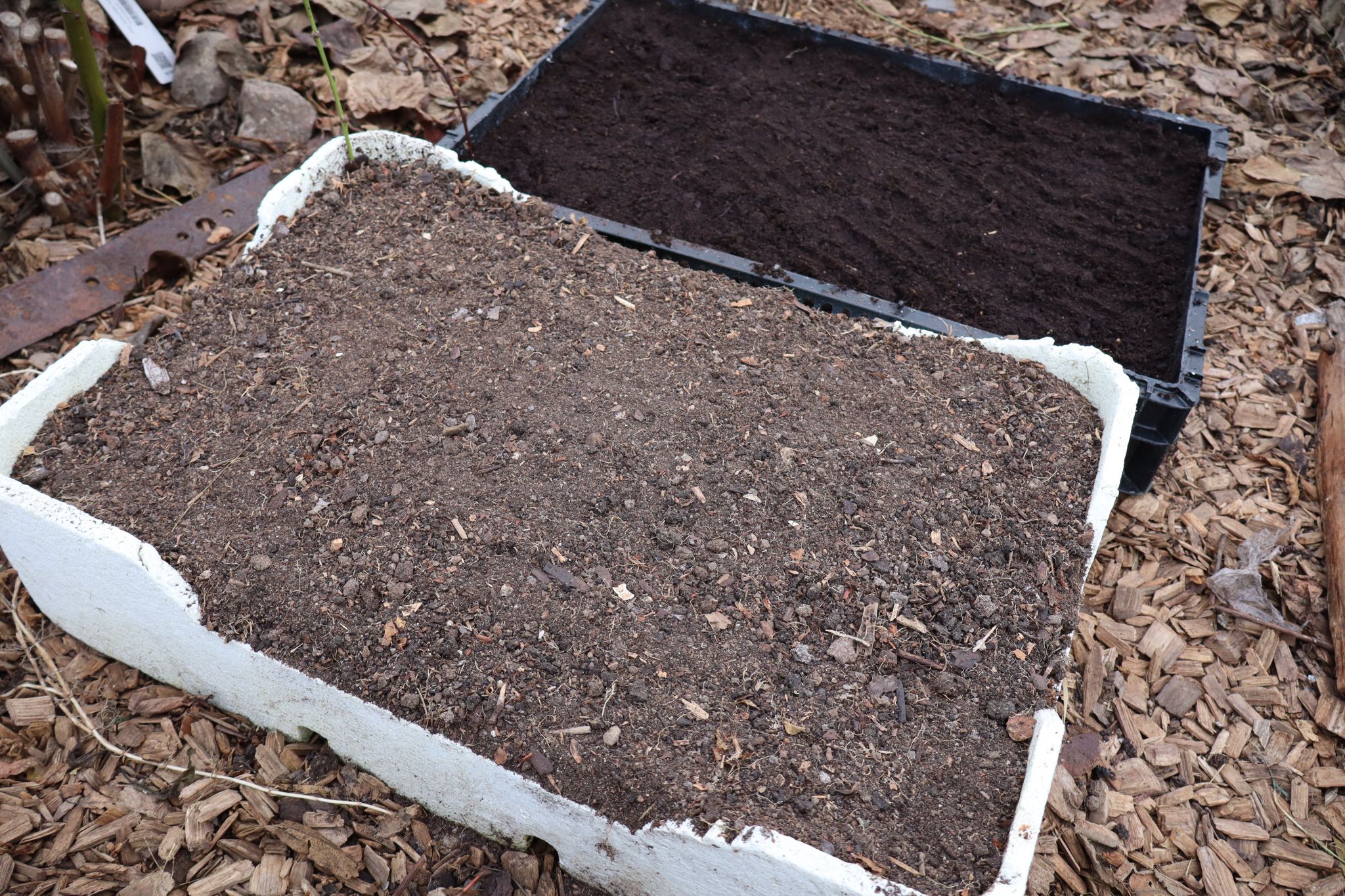 Sådden är klar, bara att vänta! Nu när det väntas lite regn om dagarna kånkarna jag ut backarna så att sådderna fuktas utan att jag behöver vattna på dem. Sedan täcks de med plast för att fröerna ska gro lite snabbare.