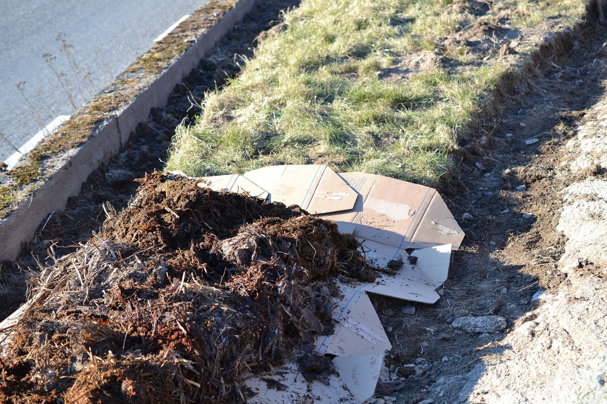 Ovanpå gräset ligger nu ett lager kartong och ovanpå det färsk hästgödsel.