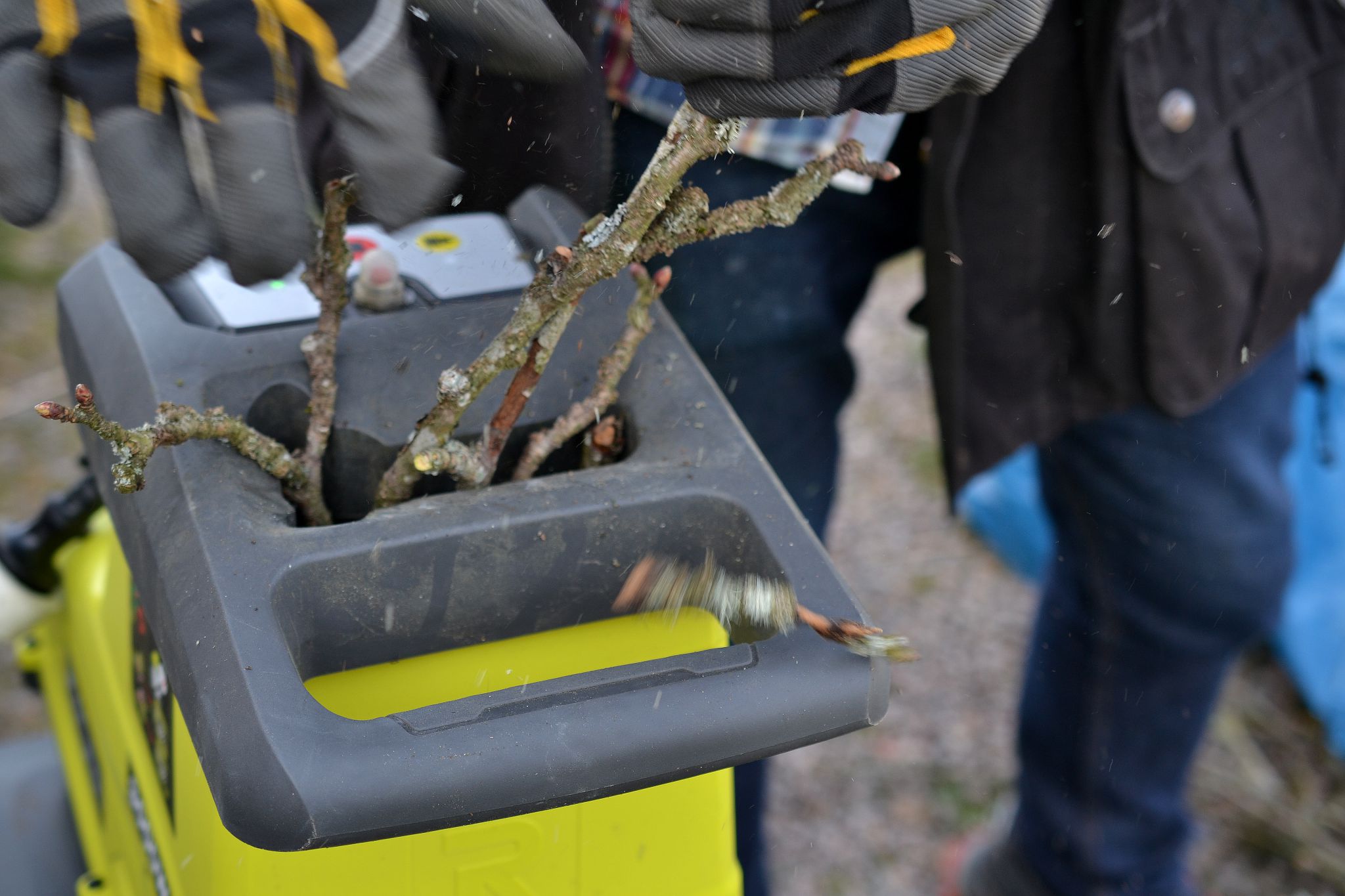 Också små och korta kvistar matas sönder till flis, så länge de går att peta ner i apparaten.