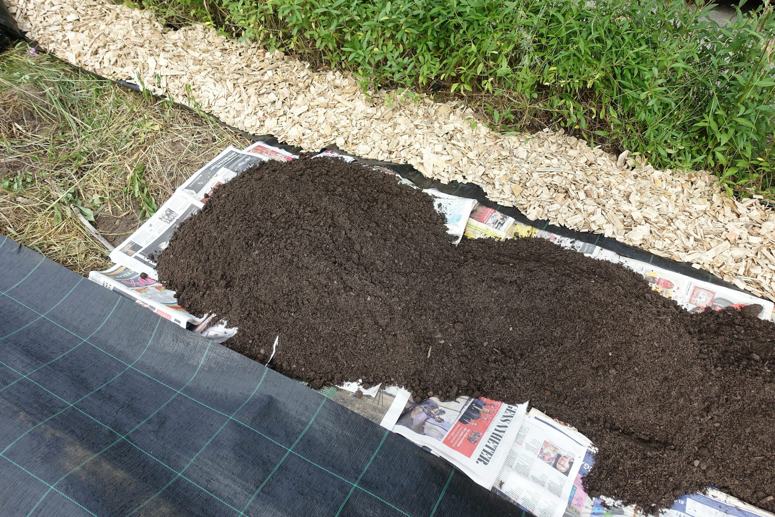 odlingsbäddar, raised beds, wood chips, träflis, skillnadens trädgård, sara bäckmo, sara backmo, sara's kitchen garden, tidningar, täckodling, jord, soil