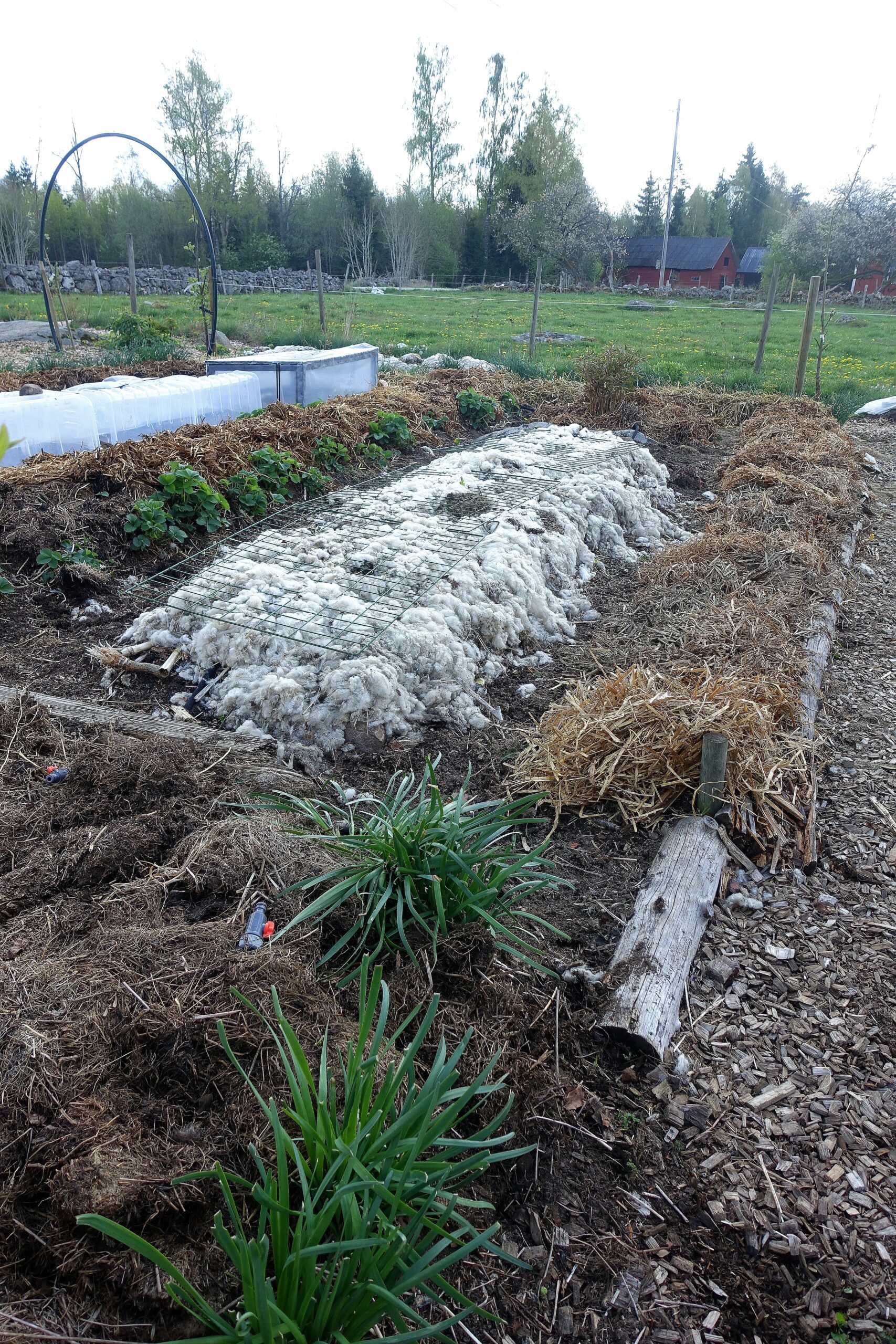 Övergripande bild på köksträdgården med bäddar täckta av halm/gräs och ull.