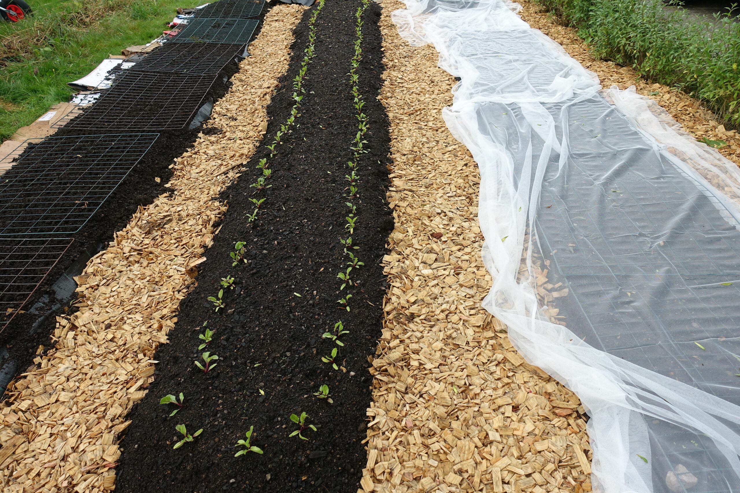 odlingsbäddar, raised beds, wood chips, träflis, skillnadens trädgård, sara bäckmo, sara backmo, sara's kitchen garden, kålnät, lill, gardin,