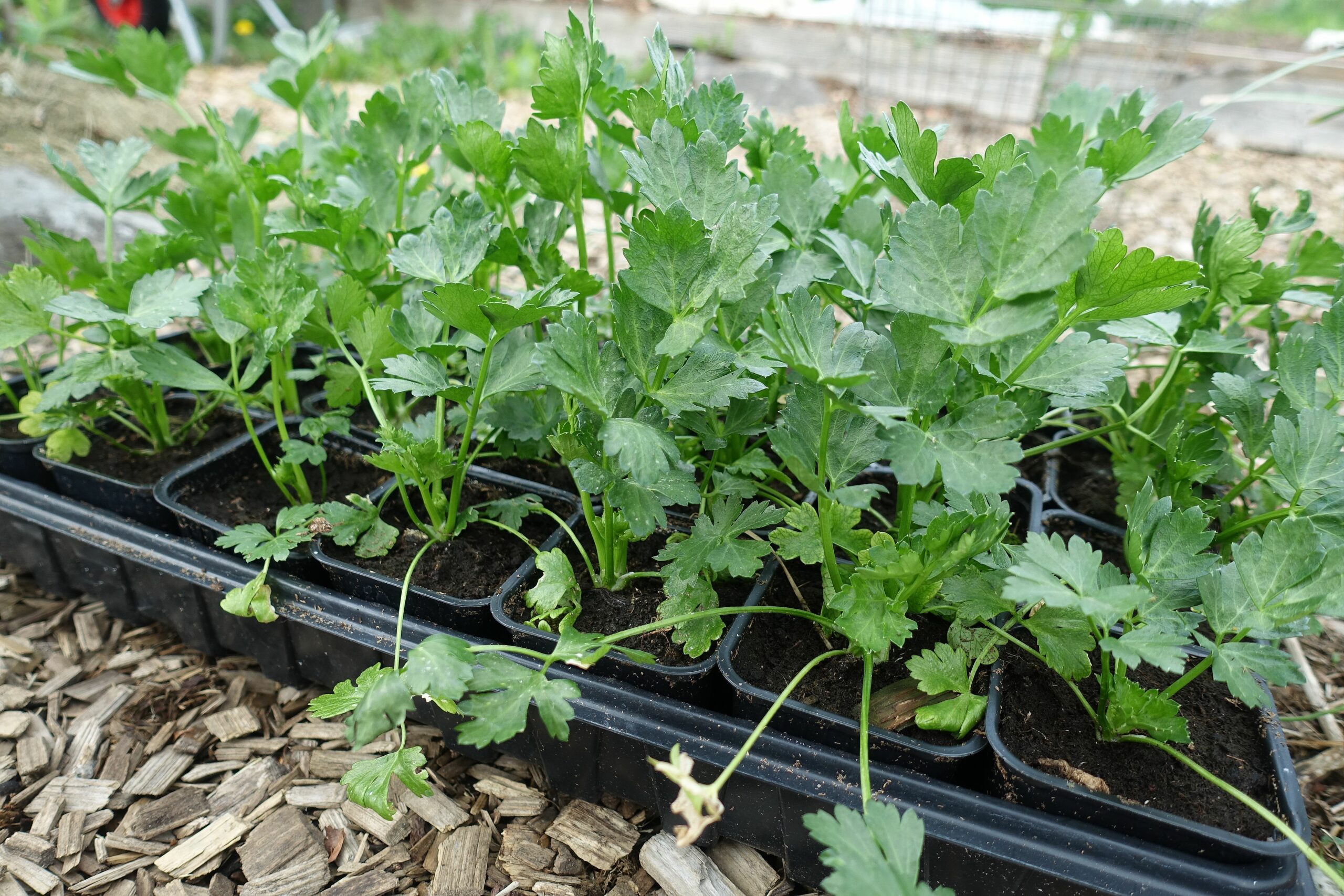 Ett tråg med rotselleri redo för utplantering i min trädgård.