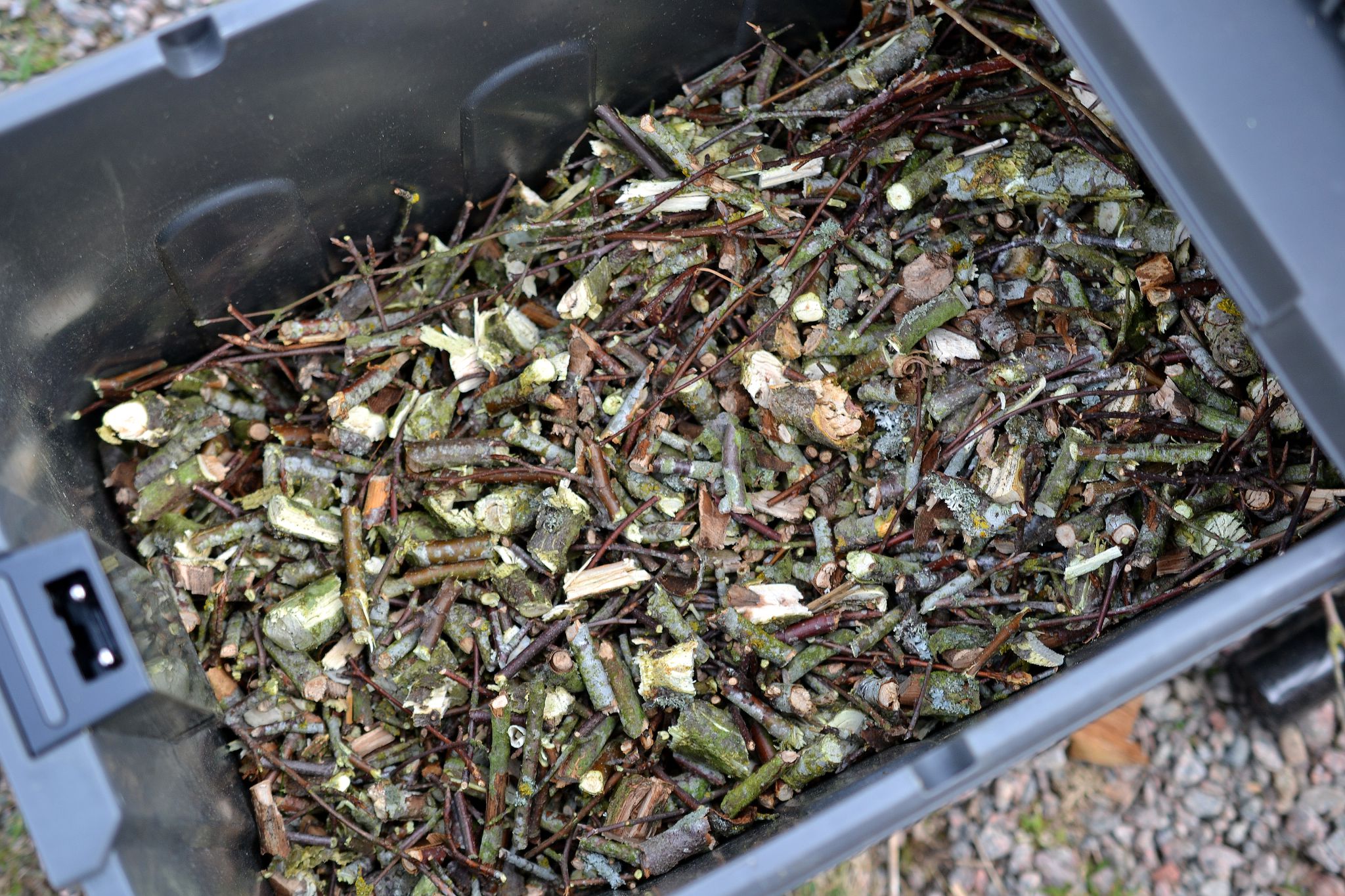 En titt ner i behållaren under kompostkvarnen. Prima träflis från mina fula kvistar.