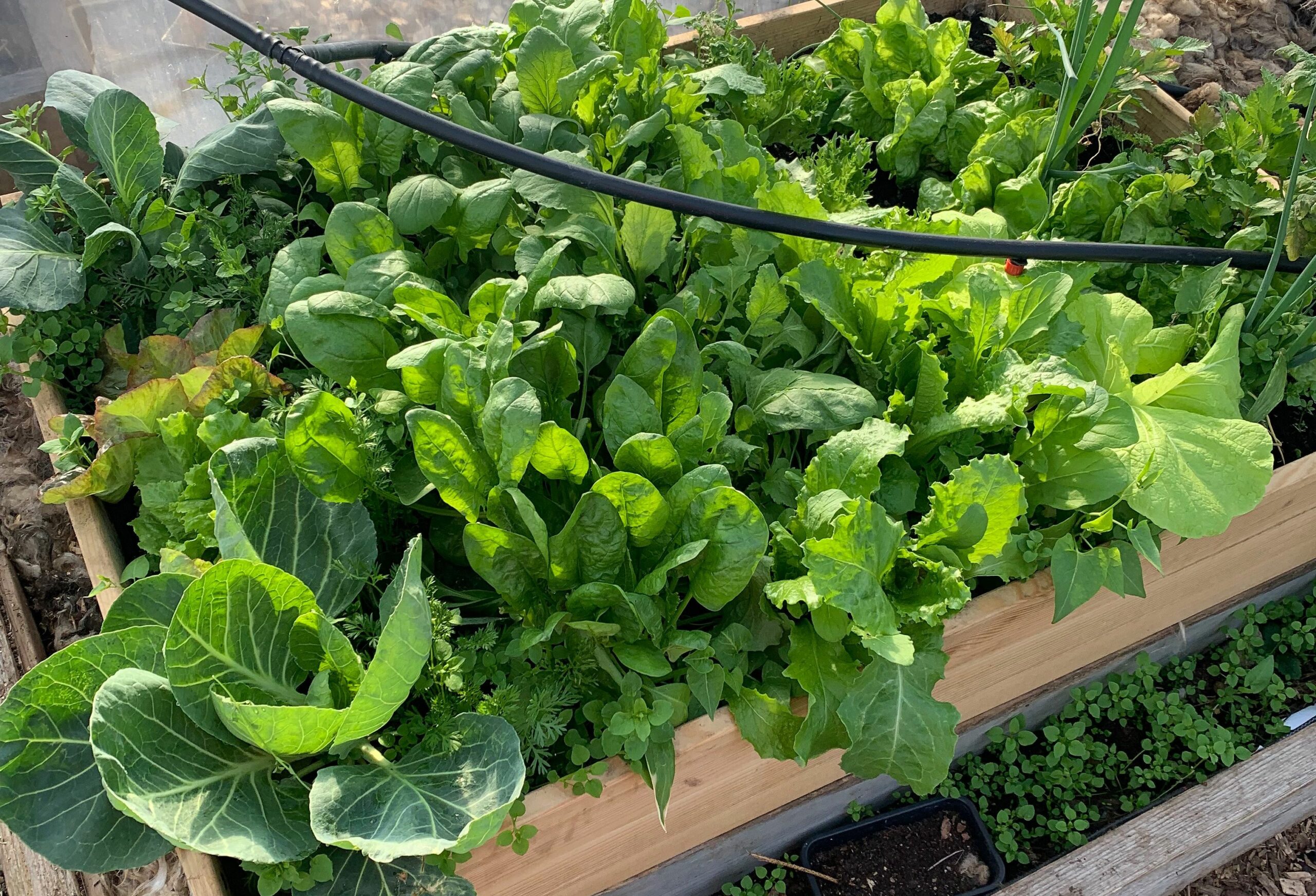 Två av kålplantorna sattes ut i varmbänken i februari, de växer i bänkens bägge vänstra hörn. Som du ser är de mindre i storlek än plantorna på bild nedan, trots den varma växtplatsen och tidiga utplanteringen.