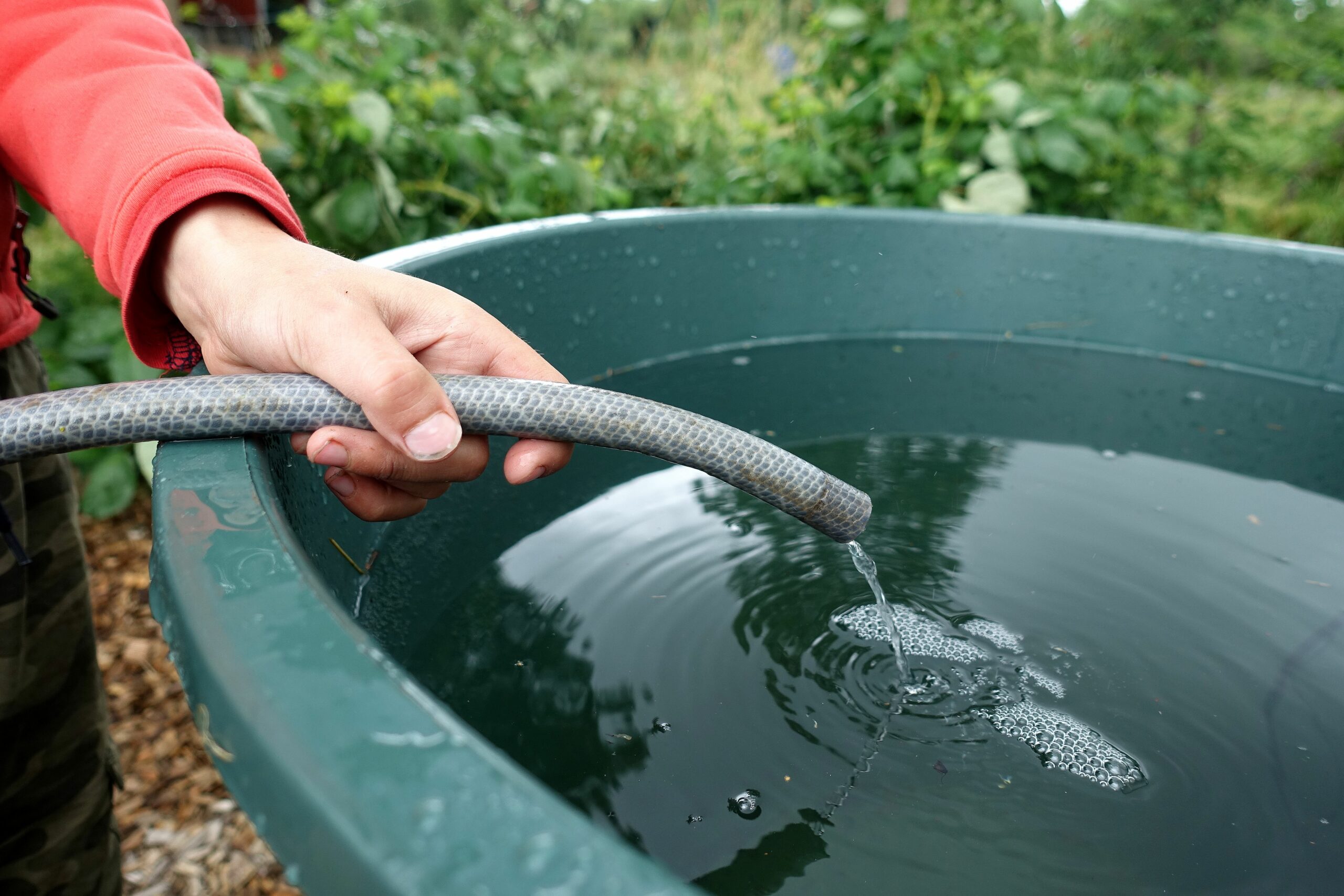 Beroende på hur mycket vatten det är i den blå tunnan töms den mer eller mindre fort genom slangen ner i tunnan vid stora växthuset.