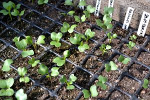 Bild från april 2016, vintersådd kål i pluggbrätte. Här är olika sorters grönkål.